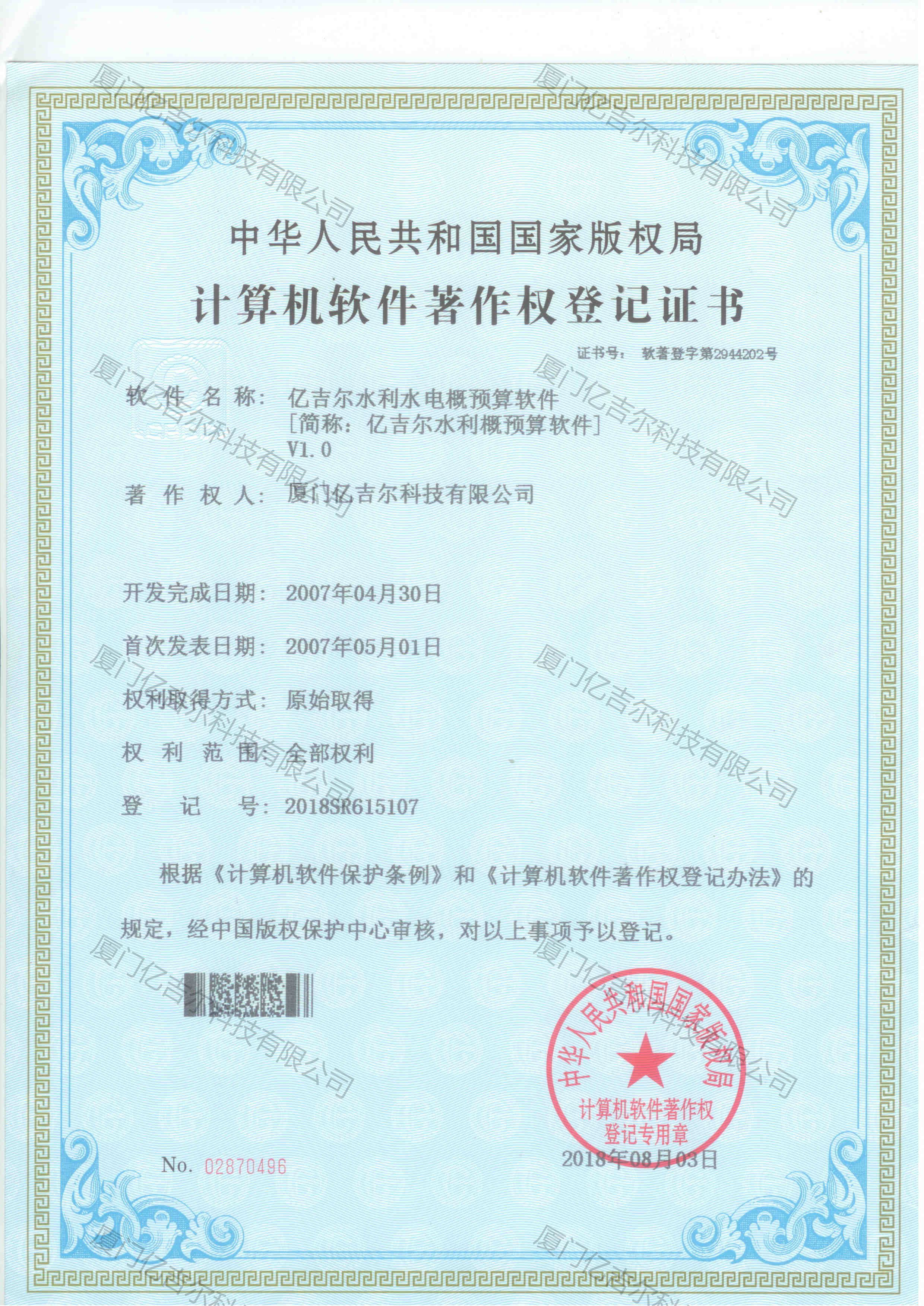 億吉爾水利水電概預算軟件著作權(quán)登記證書 發(fā)布日期:2018年08月03日 瀏覽次數(shù):3247 關(guān)鍵字: 公司 1/1億吉爾水利水電概預算軟件著作權(quán)登記證書