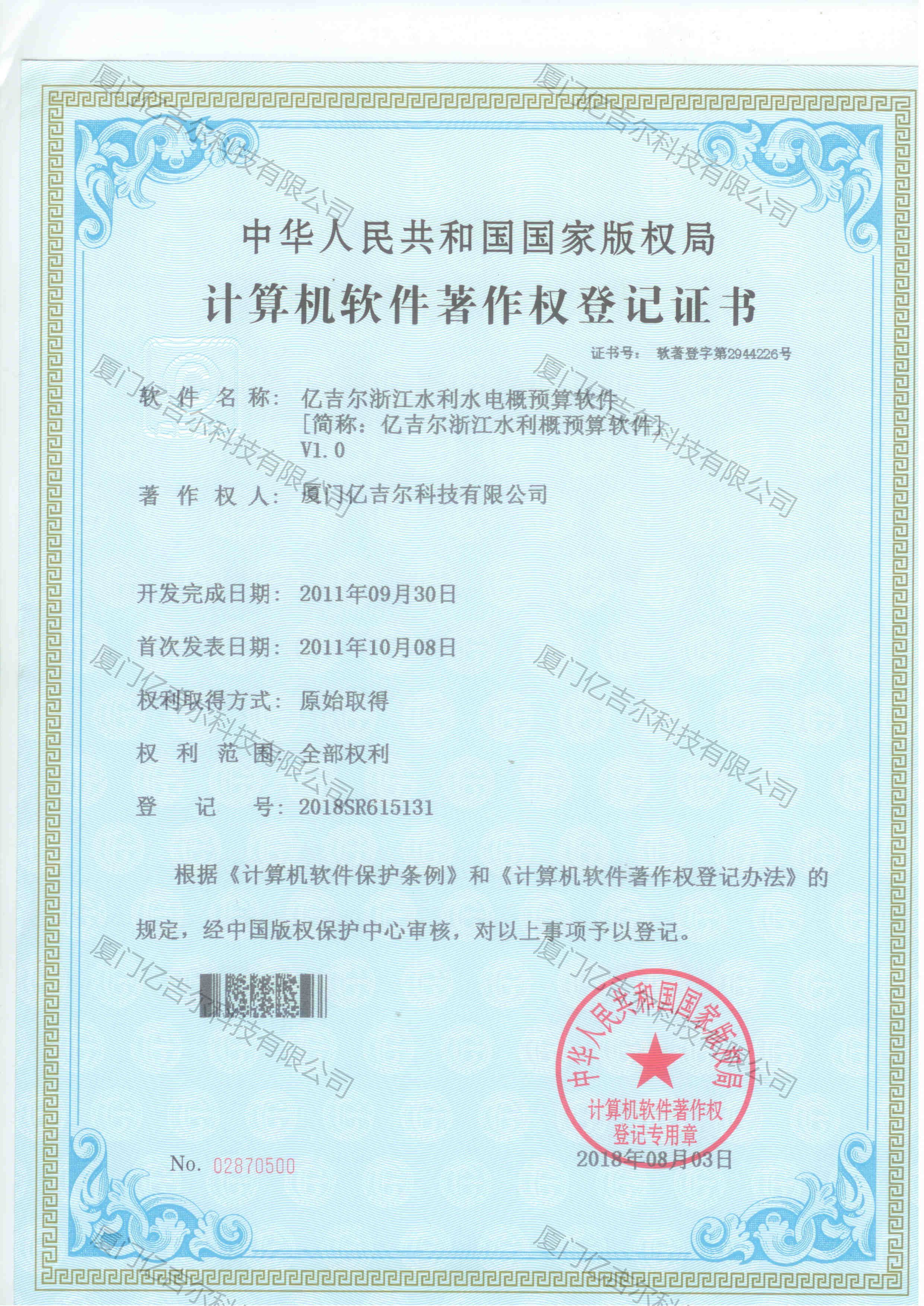 億吉爾浙江水利水電概預(yù)算軟件著作權(quán)登記證書 發(fā)布日期:2018年08月03日 瀏覽次數(shù):3189 關(guān)鍵字: 公司 1/1億吉爾浙江水利水電概預(yù)算軟件著作權(quán)登記證書